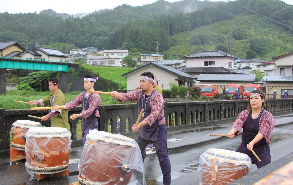 本社の愛宕神社は京都にある火伏の神様であり、戦後、重ねて大火災があったため、昭和27年、祭典復興の大祭礼が行われ、現在でも、3年に一度大祭が行われている、水かけ祭りと呼ばれる行事です。御輿の担ぎ手は地元の消防団員達で、桜木橋を往復する際に、消防団がホースで御輿めがけて一斉に放水します。また、沿道の人々からバケツやホースで水をかけられることもあります。神輿の渡御には、古式の行列をもって賑やかに行われ、町民に親しまれている祭りです。